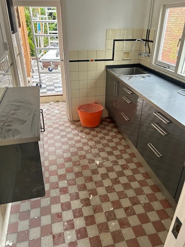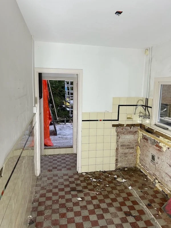 De aanbouw is verwijderd en opgeruimd. Door naar de bijkeuken