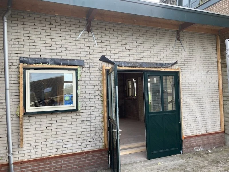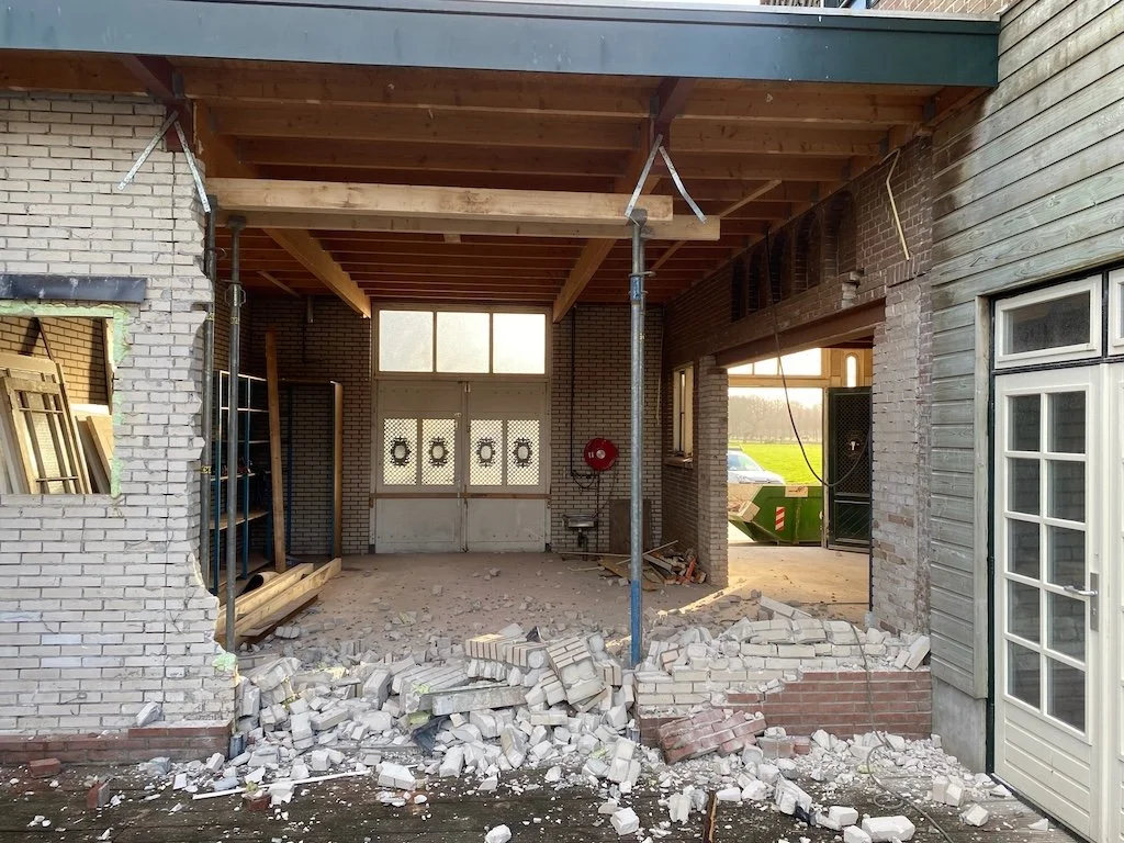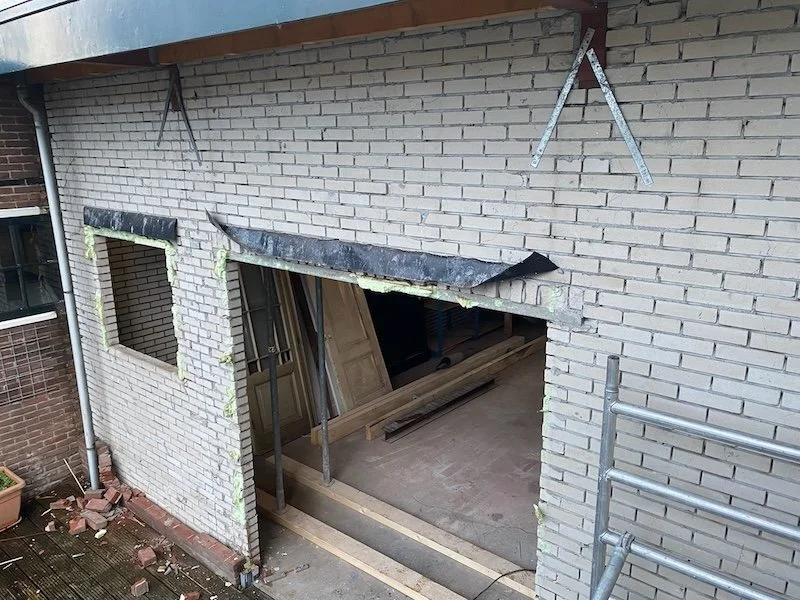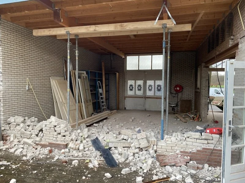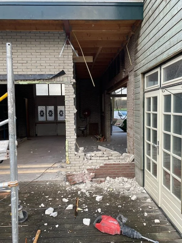 Om ruimte te maken voor uitbreiding hebben wij de gevel van dit gebouw verwijderd. Bij dragende constructies zorgen wij altijd dat er juist en voldoende gestut wordt, om scheurvorming en instortgevaar te voorkomen.