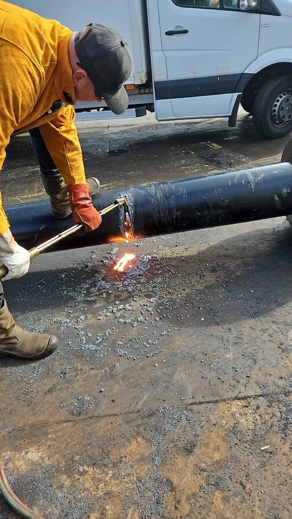 Een begin maken aan het snijden van de massieve zuiger. De temperatuur van de brander kan oplopen tot meer dan 1.300 graden Celsius. Warmer dan lava!